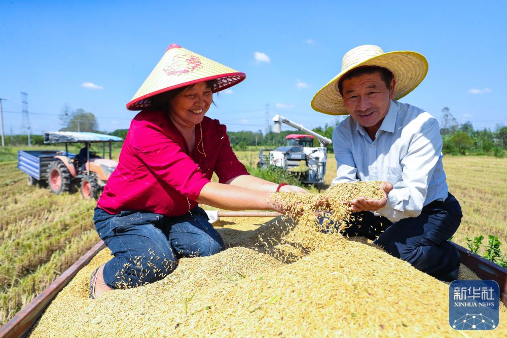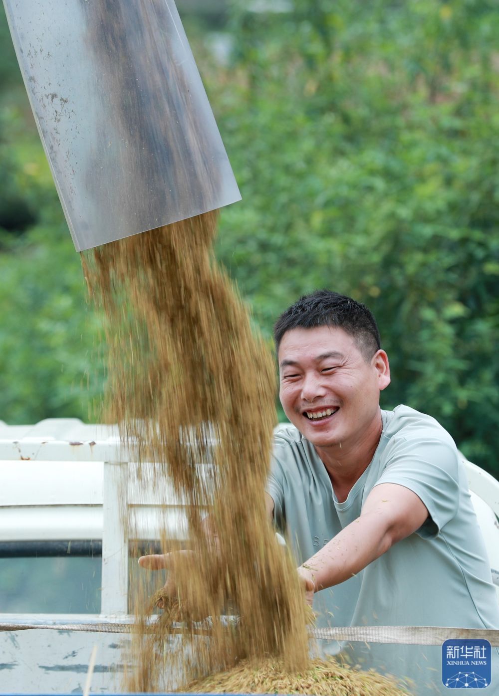 9月22日,在湖北省秭歸縣九畹溪鎮(zhèn)石柱村,村民在查看剛收割的冷水稻谷。