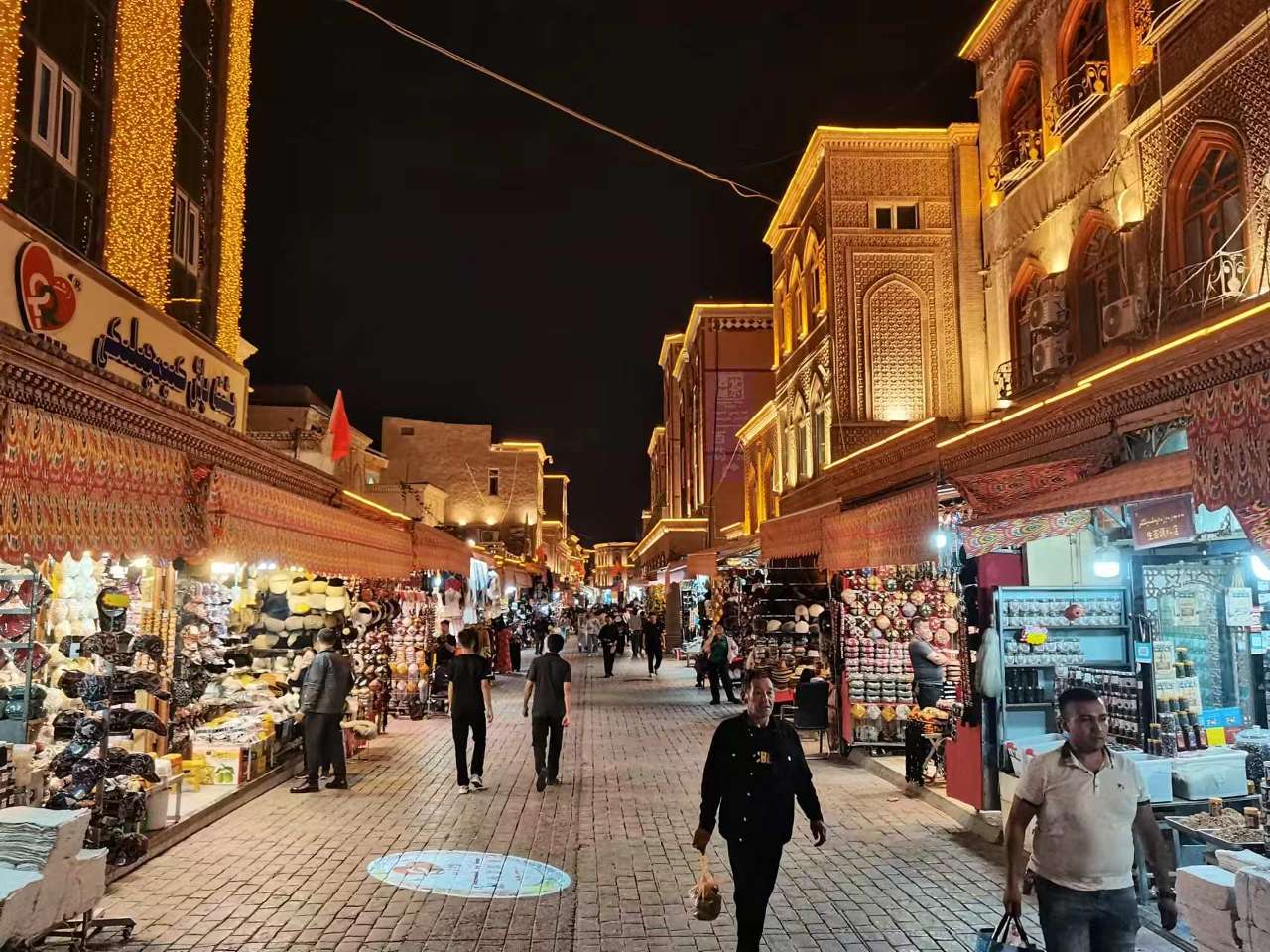 入夜,漫步在新疆喀什古城,各色燈光打在土黃主色調(diào)的墻體,勾勒出溫暖柔和的光暈。傳統(tǒng)與“摩登”在這里碰撞,異域與本土風情在這里交融,“汗巴扎”夜市里各式各樣民族特色美食考驗著味蕾,各民族人們載歌載舞,共度屬于他們的歡樂時光。
