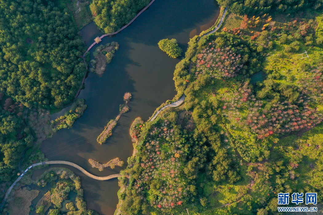 長(zhǎng)汀縣水土保持科教園地處河田鎮(zhèn)露湖村,是福建省面積最大的水土保持科教基地(無(wú)人機(jī)照片)。新華網(wǎng) 肖和勇 攝