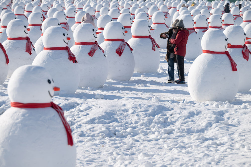 1月4日,在北大荒集團(tuán)閆家崗農(nóng)場(chǎng),游客在雪人群中游覽。