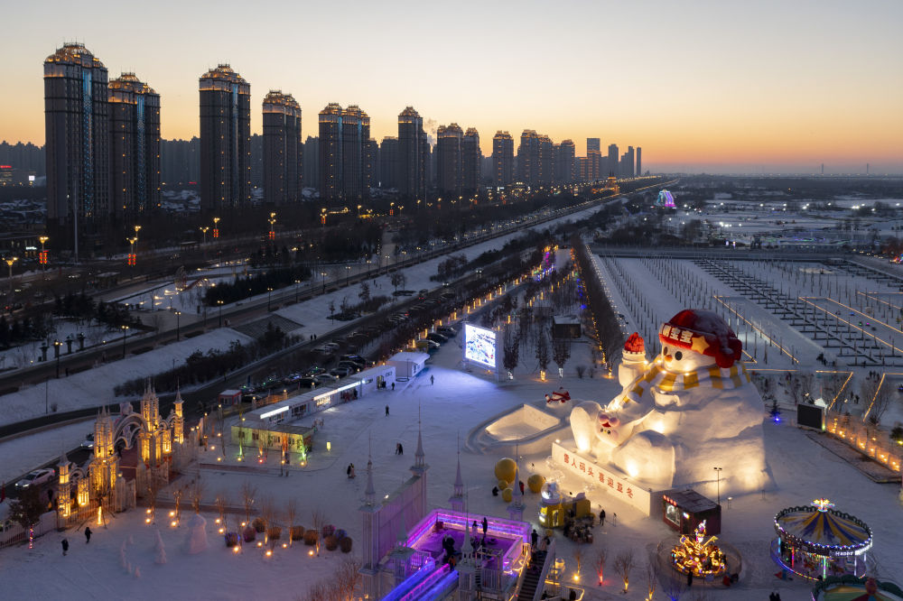 1月3日,游客在哈爾濱群力音樂公園“網(wǎng)紅大雪人”附近游玩(無(wú)人機(jī)照片)。