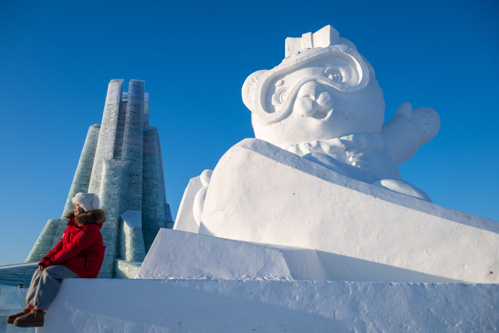 1月3日,在哈爾濱冰雪大世界園區(qū),游客與亞冬會(huì)吉祥物雪雕“濱濱”合影。
