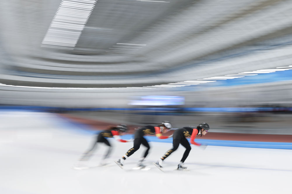 2024年12月15日,黑龍江省冰上訓(xùn)練中心二隊選手在比賽中。當日,2024-2025賽季中國杯速度滑冰精英聯(lián)賽第四站暨亞冬會測試賽女子團體追逐比賽在黑龍江省冰上訓(xùn)練中心舉行。