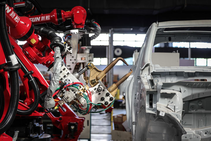 2024年6月3日拍攝的點焊機器人。機器人被廣泛應(yīng)用于工業(yè),它們能夠勝任繁重、危險或復(fù)雜的工作,提高生產(chǎn)效率和經(jīng)濟效益。新華社記者 潘昱龍 攝