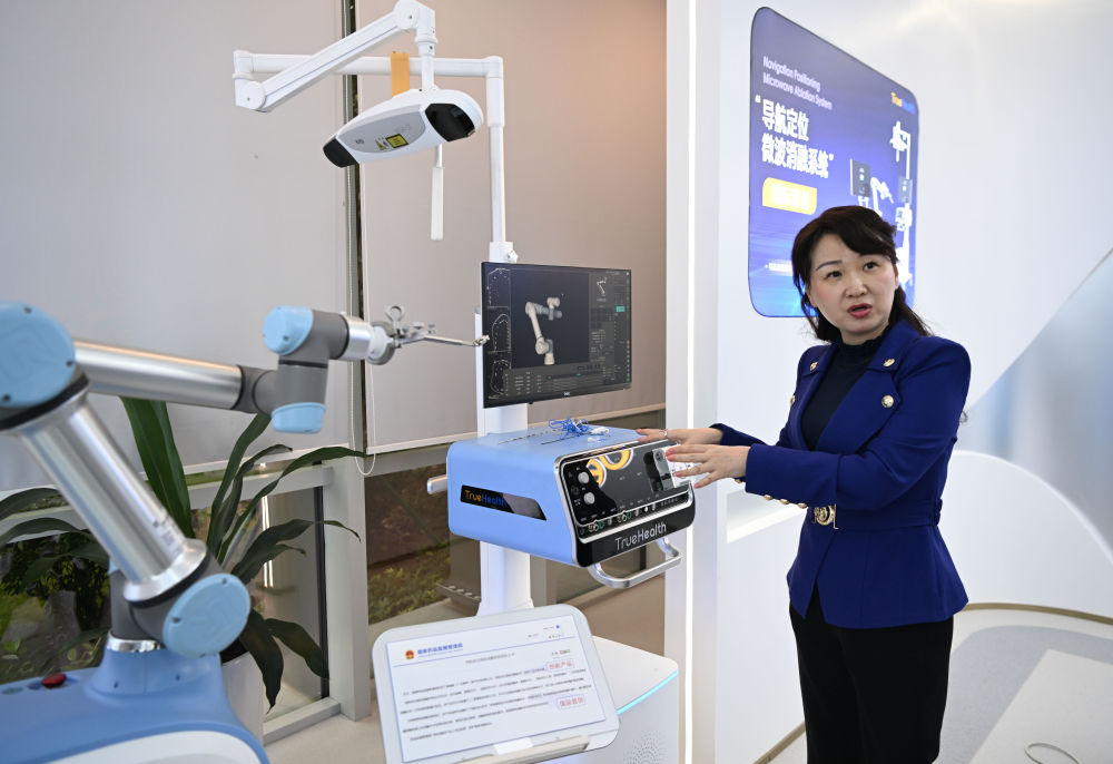 澳門(mén)企業(yè)真健康(廣東橫琴)醫(yī)療科技有限公司創(chuàng)始人張昊任在介紹“導(dǎo)航定位微波消融系統(tǒng)”(2024年11月24日攝)。新華社記者 鄧華 攝