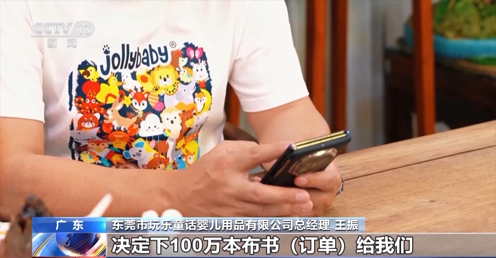 東莞市玩樂童話嬰兒用品有限公司總經(jīng)理 王振:到晚上12點(diǎn)多他們就發(fā)信息給我,決定在我們這里下100萬(wàn)本布書訂單,當(dāng)時(shí)我們大家非常非常興奮。