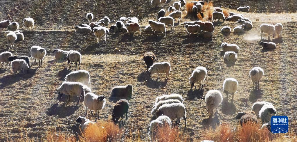 夕照下的羊卓雍措附近的羊群(11月7日,手機(jī)拍攝)。新華社記者 沈虹冰 攝