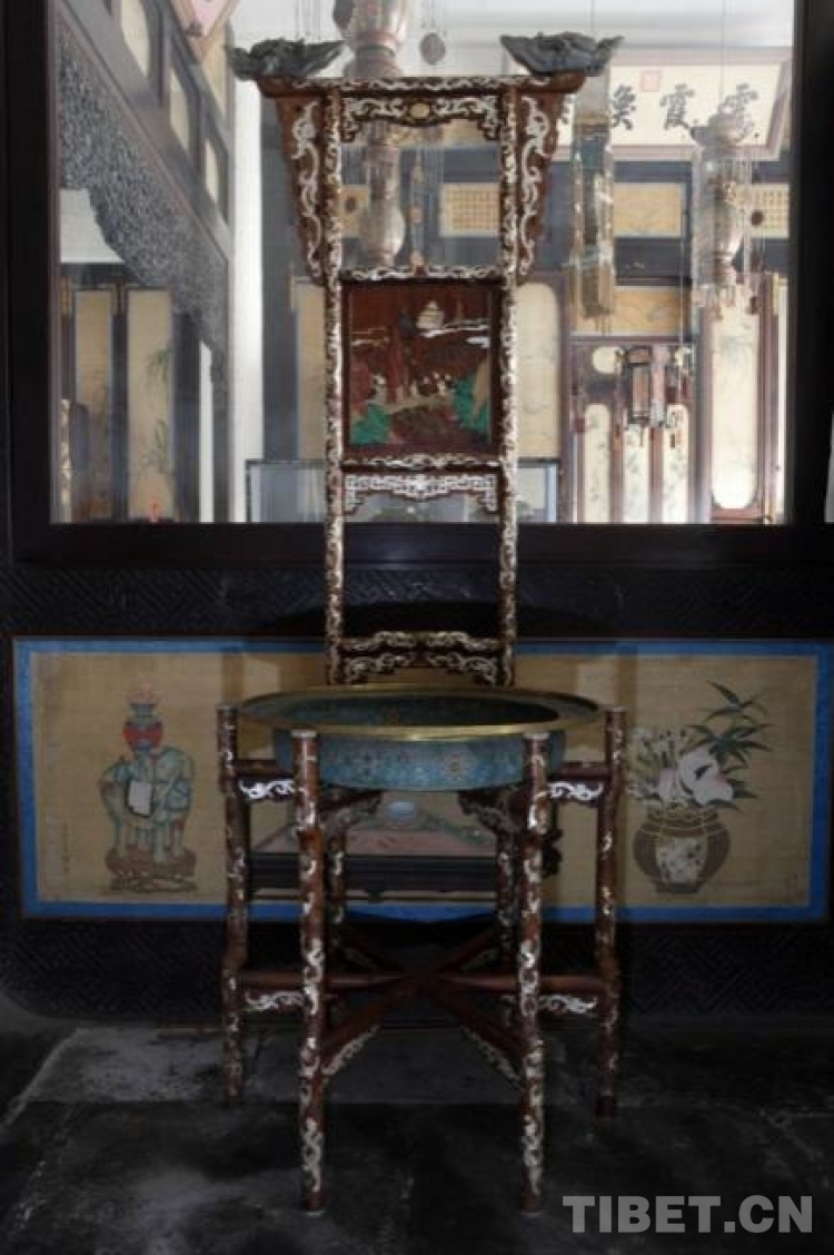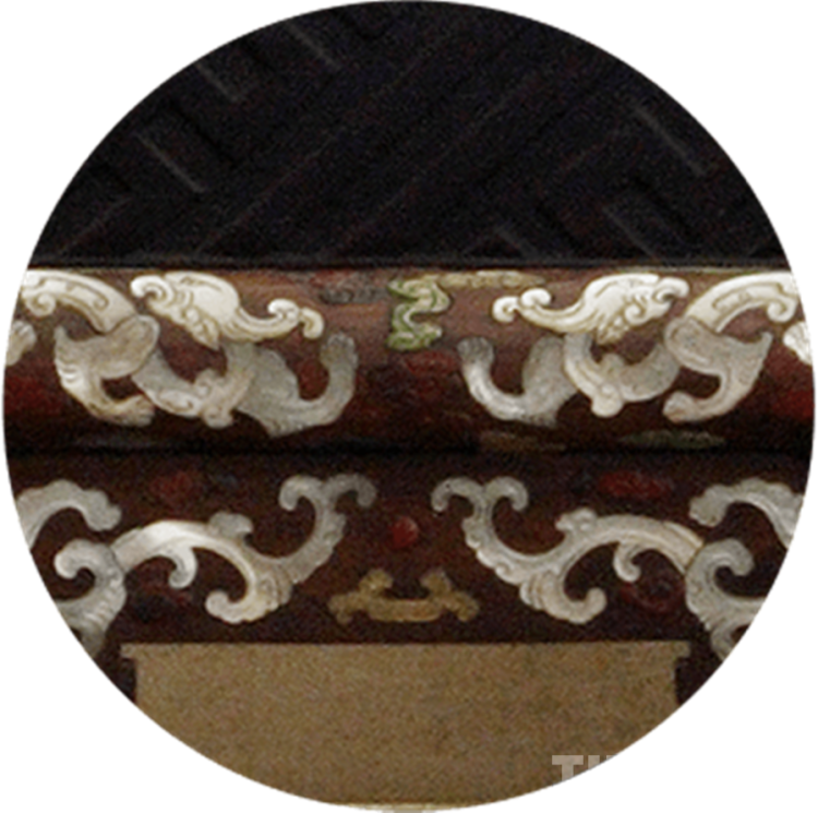 此款黃花梨木百寶嵌龍紋盆架,通體鑲嵌由螺鈿雕刻而成的草龍及拐子龍。前足高74.5厘米,通高201.5厘米,徑71厘米 。盆架六足,由兩層相交的棖子相連。選材優(yōu)良,質堅且木色、紋理俱佳。中牌子鑲嵌更見華麗,由牙、角、綠松石、壽山石、瑪瑙、金、銀等組成職貢圖,其中有高山陡崖、蒼松流水及各色人物,遠處彩色祥云中呈現高大的殿堂,猶如人間仙境。(中國西藏網 綜合/周晶)