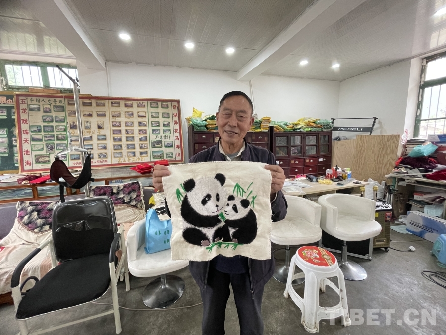 黃能貴老師正在給大家展示刺繡作品 攝影:莫干措