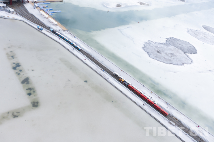 圖為航拍茶卡鹽湖小火車(chē)。攝影:趙振宇