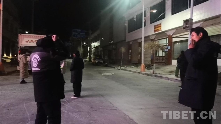 圖為1月13日晚21:14西藏自治區(qū)日喀則市定結(jié)縣縣城街頭避險(xiǎn)的人們 攝影:劉莉