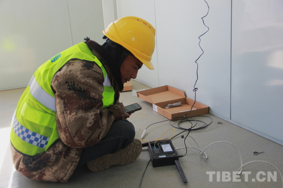 圖為中國電信日喀則分公司智慧家庭工程師多次正在長所鄉(xiāng)森嘎村新建板房里調試光貓信號 攝影:劉莉