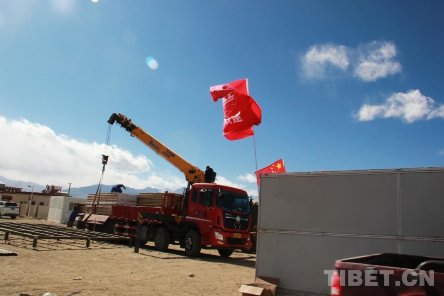 圖為工作人員正在長所鄉(xiāng)森嘎村卸新運到的板房 攝影:劉莉