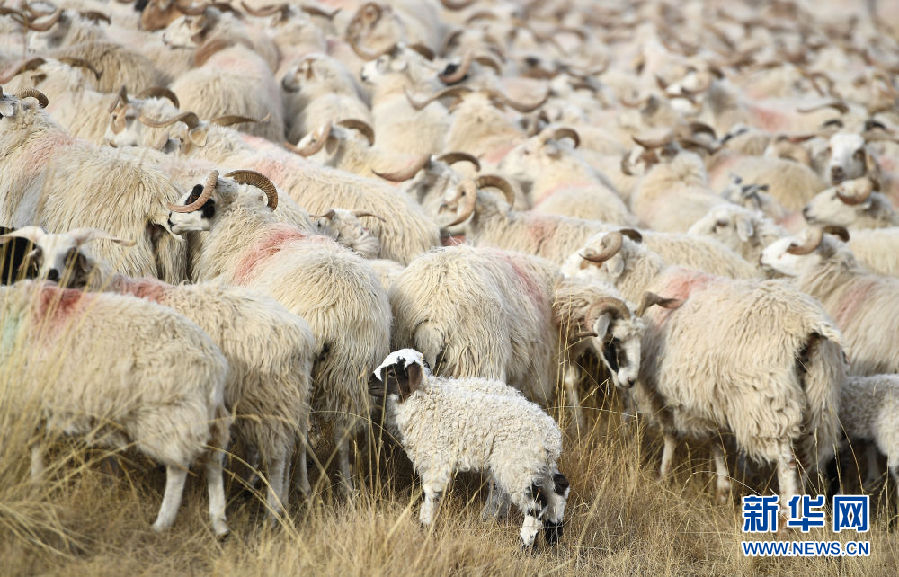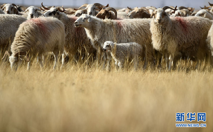 初冬時節(jié),一場小雪浸潤了青海湖北岸的草原,披著薄紗的草原草色金黃,這里成為母羊產羔的大“產房”。