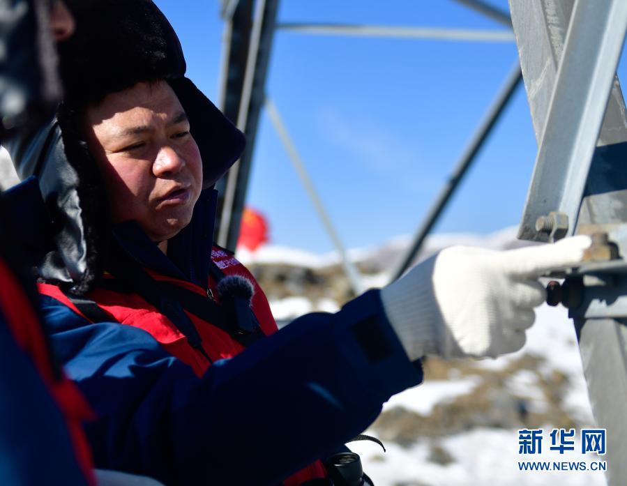 1月21日,國(guó)家電網(wǎng)西寧供電公司輸電運(yùn)檢中心運(yùn)檢人員在查看線路覆冰情況。新華社記者 張龍 攝