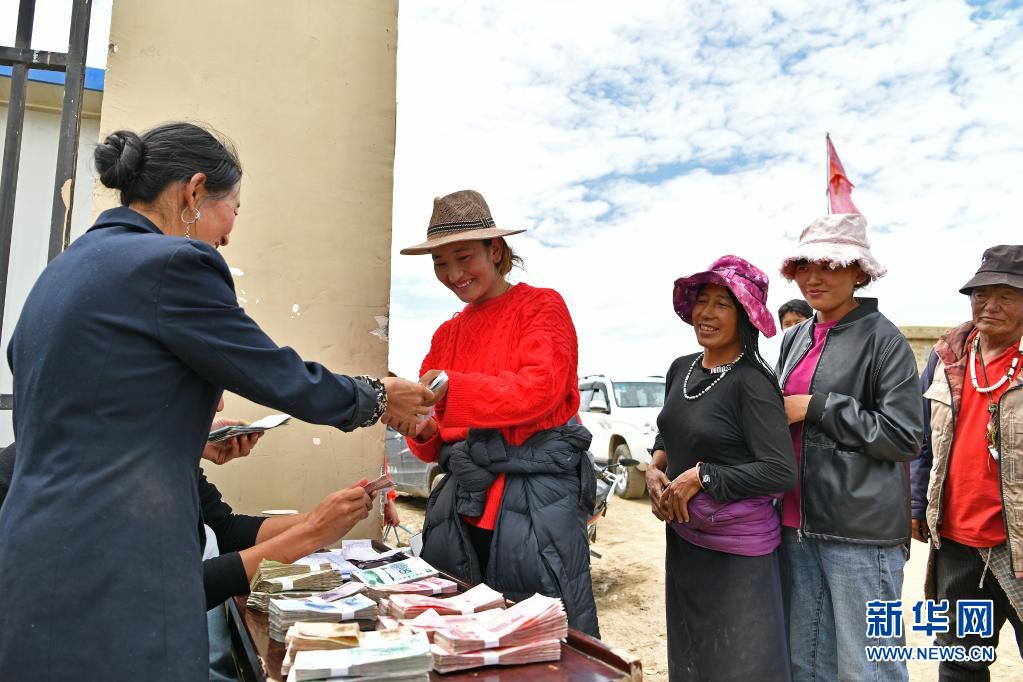 7月17日,壤塘縣瑟谷村農(nóng)牧民在領取務工收入。新華社記者 李鑫 攝