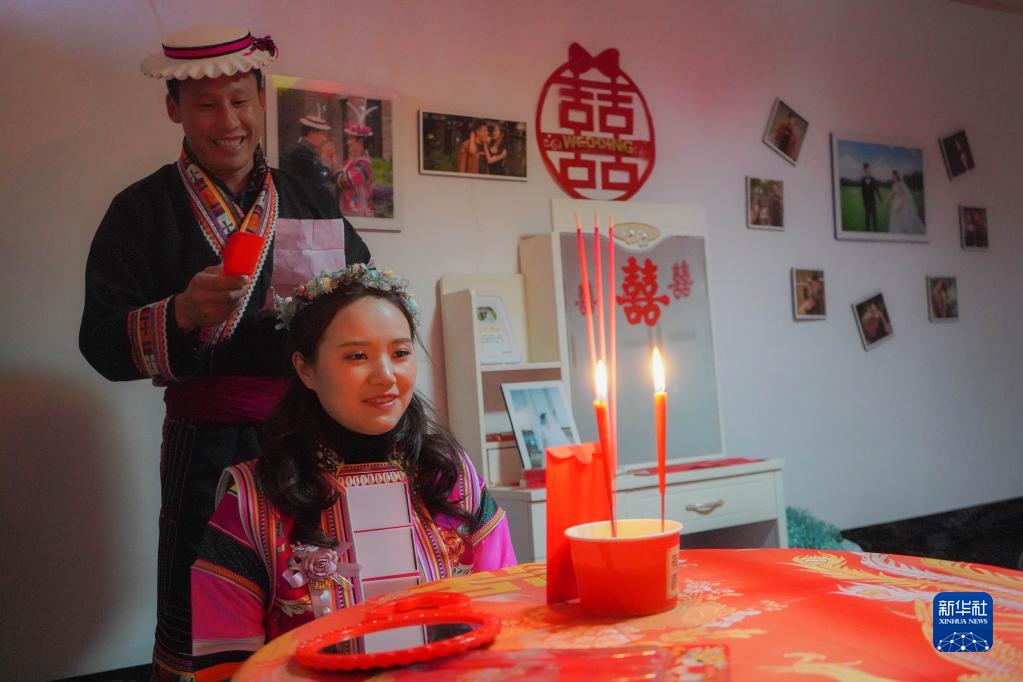 1月13日,在隴南市文縣鐵樓藏族鄉(xiāng)寨科橋村的白馬藏族婚禮上,新娘和新郎準(zhǔn)備向賓客敬酒。新華社記者 郎兵兵 攝