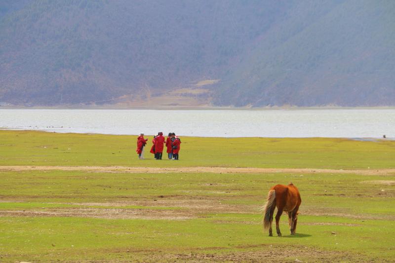 春分節(jié)氣前后,香格里拉氣溫回暖,納帕海的草原也逐漸染綠,游客們在欣賞草原春景的同時(shí)也不忘合影留念。