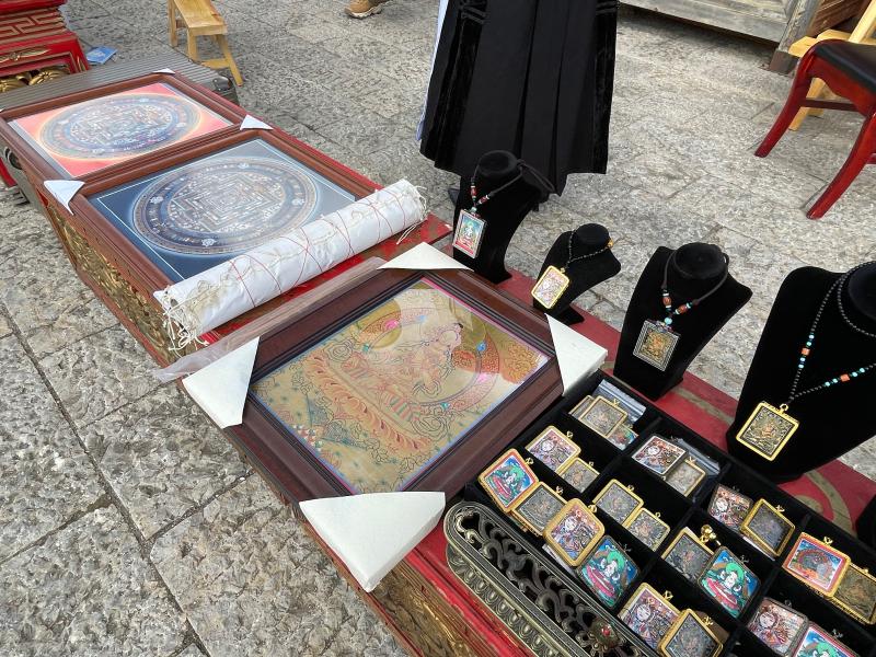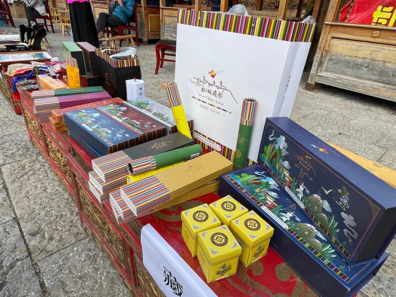 活動現(xiàn)場陳列的非遺產品:尼西土陶、木碗、藏香等精美展品吸引了眾多游客和市民欣賞、購買。