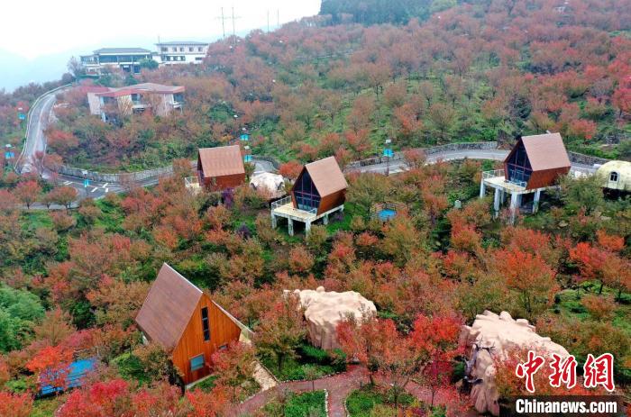 圖為彩林與一棟棟小木屋相映成趣。 伍排勇 攝