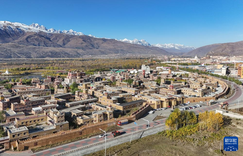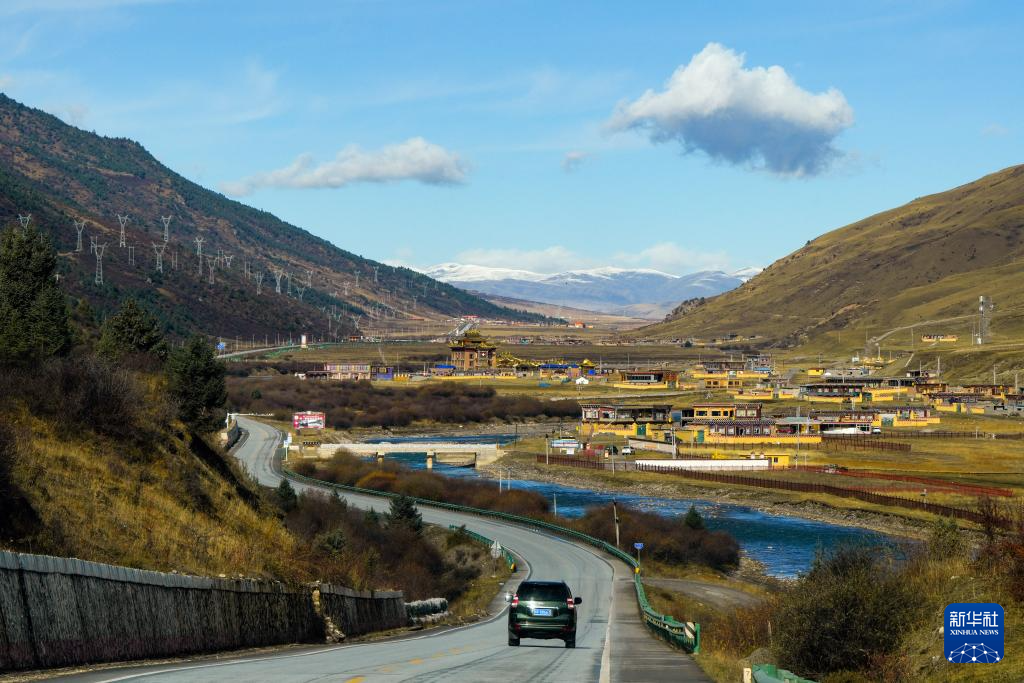 在四川省甘孜藏族自治州拍攝的國道317公路,路邊是甘孜縣格薩爾王城景區(qū)(10月29日攝,無人機照片)。新華社記者 王曦 攝