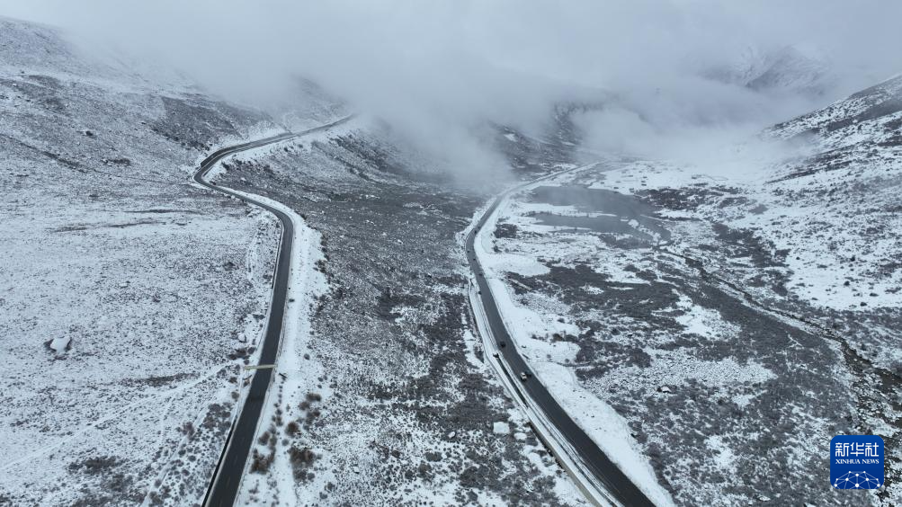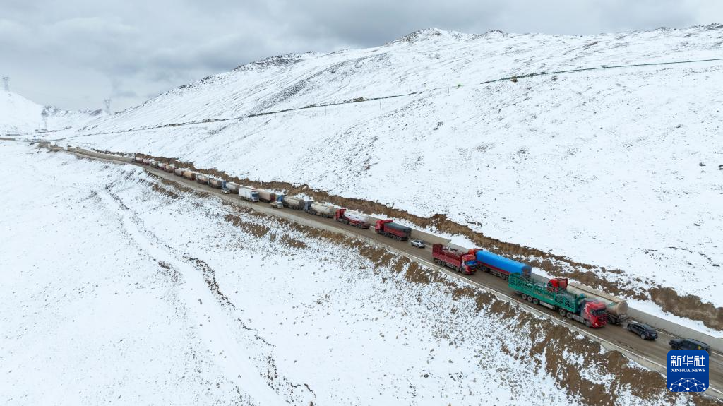 雪后,在西藏自治區(qū)左貢縣境內(nèi),車輛在通往東達山埡口的國道318公路上等待通行(11月6日攝,無人機照片)。新華社記者 沈伯韓 攝