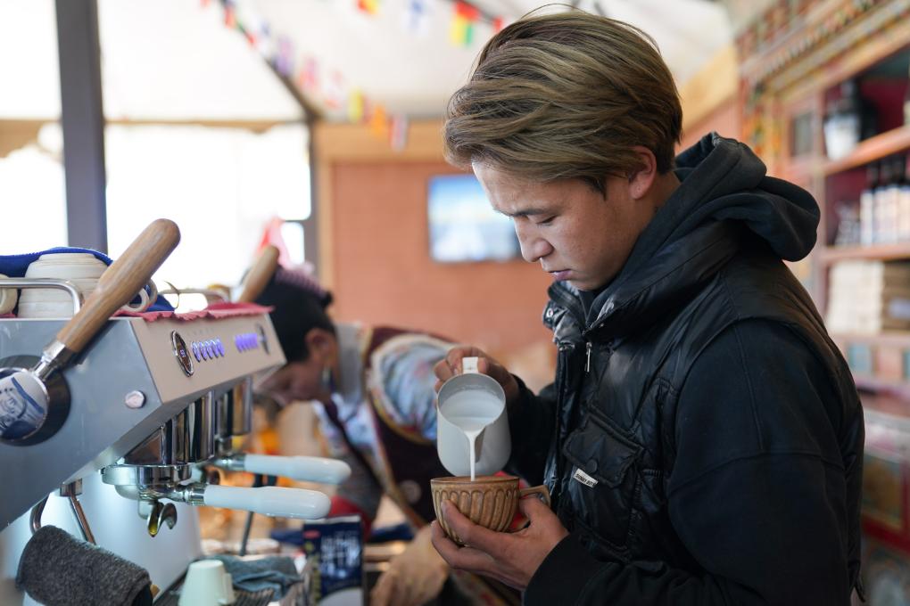 在四川省甘孜藏族自治州康定市的八郎生都村,達(dá)科在“云??Х任荨敝谱骺Х龋?0月28日攝)。