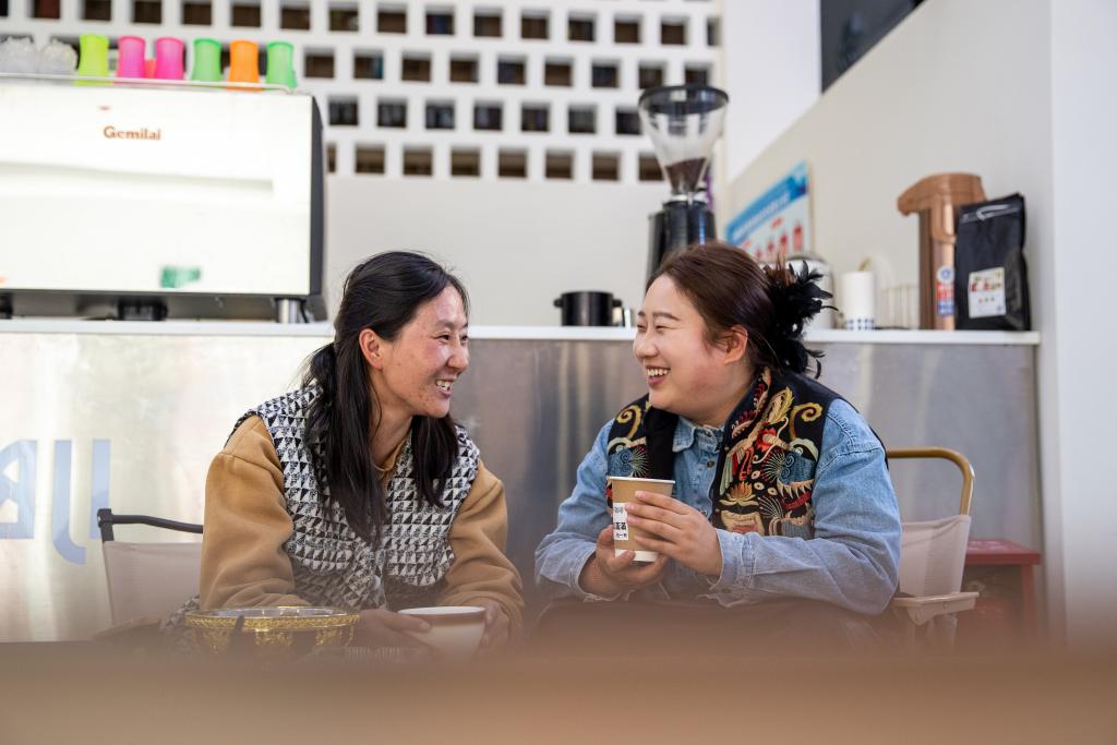 在四川省甘孜藏族自治州巴塘縣,劉莎莎在巴塘縣社會力量發(fā)展中心集群與咖啡廳的負(fù)責(zé)人格秋曲珍聊天(11月5日攝)。