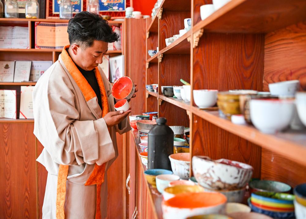 在德格縣麥宿鎮(zhèn)的扎堪倉黑陶工坊,達(dá)瓦卓瑪(右)向工坊主理人降擁格乃了解工坊近期的經(jīng)營情況以及新品研制進(jìn)展(11月4日攝)。達(dá)瓦卓瑪經(jīng)常會與麥宿鎮(zhèn)的其他手工藝者交流經(jīng)營中遇到的問題,想辦法幫他們解決。
