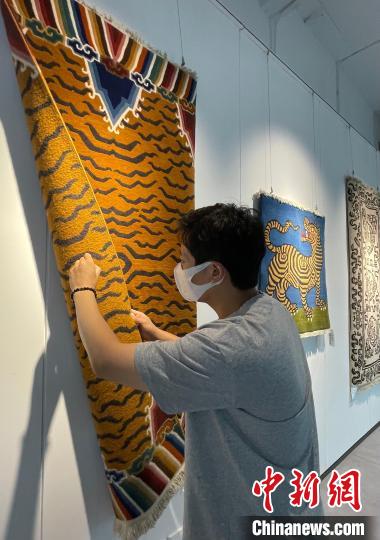 展廳中央地板上,90*190厘米的各色藏毯相連鋪開,這是藏族民眾最常用的、鋪在床鋪上的尺寸;兩旁墻上,懸掛多幅圖案復(fù)雜精細的大尺寸掛毯,這是重于藝術(shù)性的現(xiàn)代創(chuàng)作:好似唐卡的財寶天王掛毯、讓人有油畫錯覺的珠穆朗瑪峰風(fēng)景掛毯……另有一張長逾1米的虎毯,主色深黃、虎紋考究,上下兩端織有七彩紋飾,非常搶眼。若將虎毯翻轉(zhuǎn),還會發(fā)現(xiàn)反面亦是清晰齊整的虎紋,與正面幾無差異。