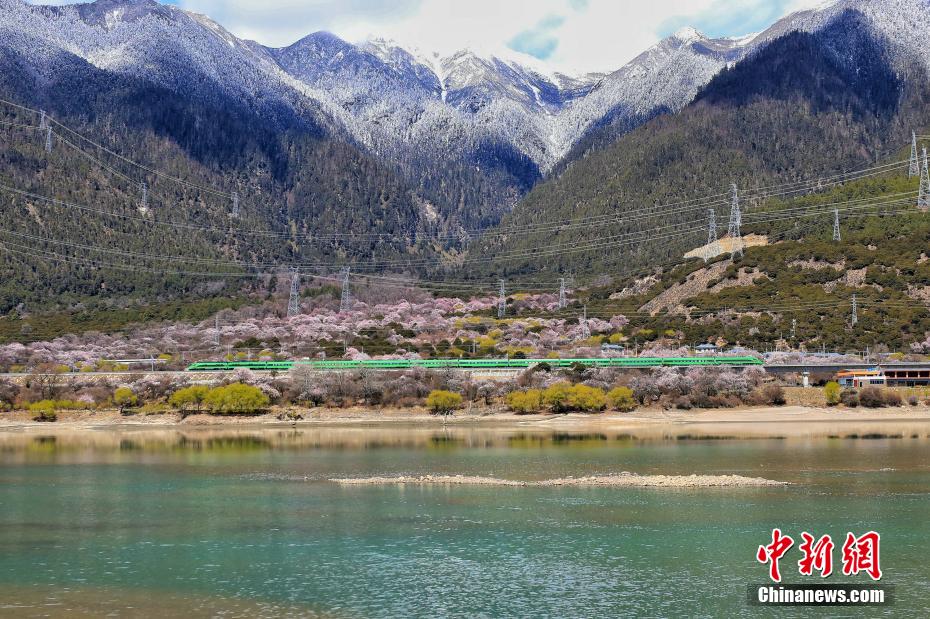 近日,中國鐵路青藏集團有限公司介紹,3月下旬至4月,拉林鐵路沿線綿延的野生桃花林盛開,藍天、白云、桃花、雪山、高原復(fù)興號動車等相互交織,形成了一幅幅美不勝收的畫面。圖為穿梭在桃花林中的拉林鐵路高原復(fù)興號。