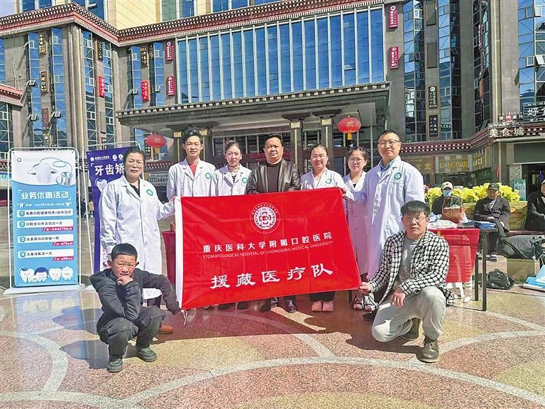 重慶醫(yī)科大學(xué)附屬口腔醫(yī)院援藏醫(yī)療隊(duì)部分成員與群眾合影。