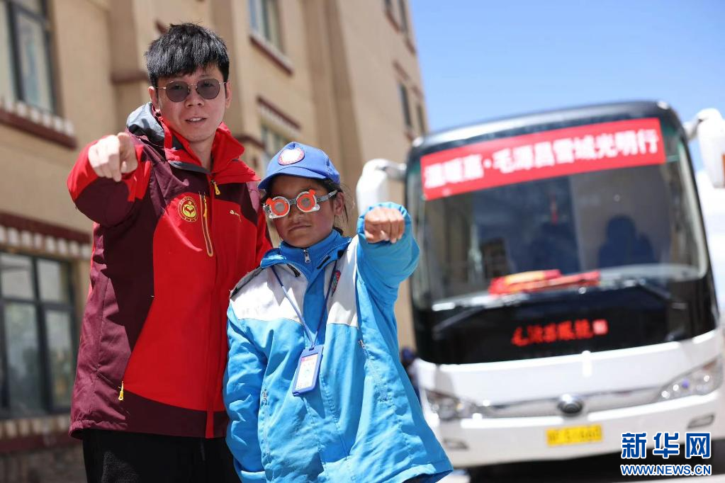 ?? 在西藏自治區(qū)那曲市色尼區(qū)第二中學(xué)(杭嘉中學(xué)),志愿者狄璐琬正引導(dǎo)戴上試戴架的學(xué)生適應(yīng)眼鏡清晰度(6月22日攝)。新華社發(fā)(趙穎碩 攝)