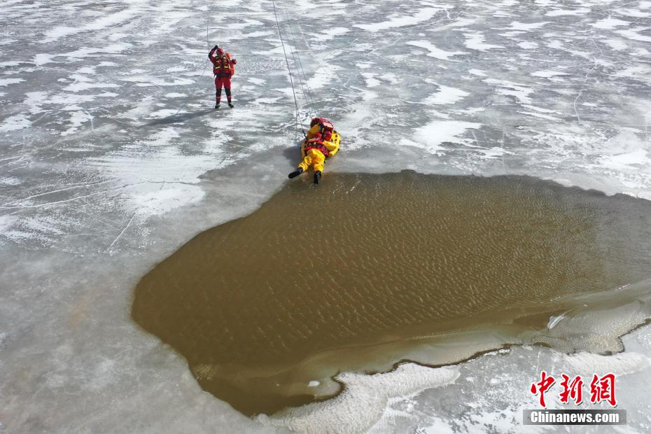 圖為冰湖演練現(xiàn)場(chǎng),救援人員向“被困人員”靠近。姚天銳 攝