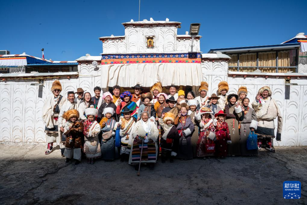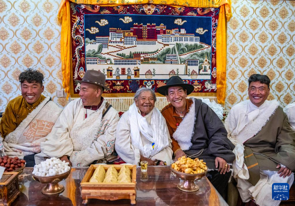 2024年藏歷新年,斯曲旺姆的兒女們帶著各自的小家庭來(lái)甲根村團(tuán)聚,孩子們依次給老人獻(xiàn)上哈達(dá)、敬上青稞酒。斯曲旺姆被滿堂兒孫圍坐中間,歡歌笑語(yǔ)回蕩在明亮寬敞的客廳里。