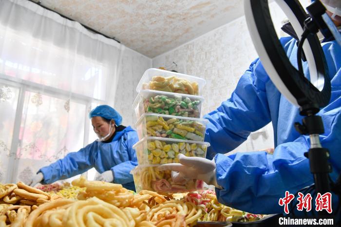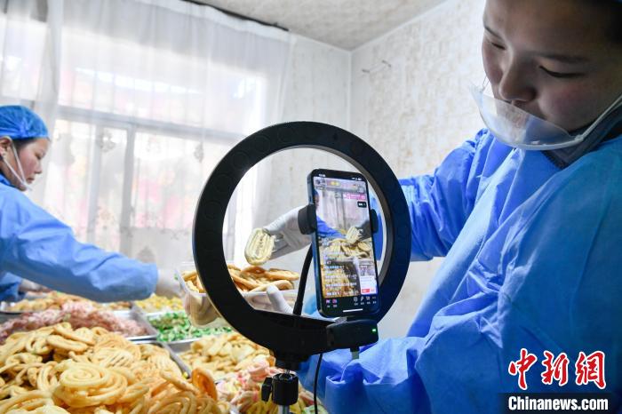 2月10日,西藏拉薩市林廓北路一家卡塞店里,工人在直播賣(mài)卡塞?!翱ㄈ笔且环N油炸面食,是藏歷新年必不可少的食物。隨著藏歷新年的日益臨近,古城拉薩各個(gè)加工銷(xiāo)售“卡塞”的店鋪飄出陣陣香味。中新社記者 貢嘎來(lái)松 攝