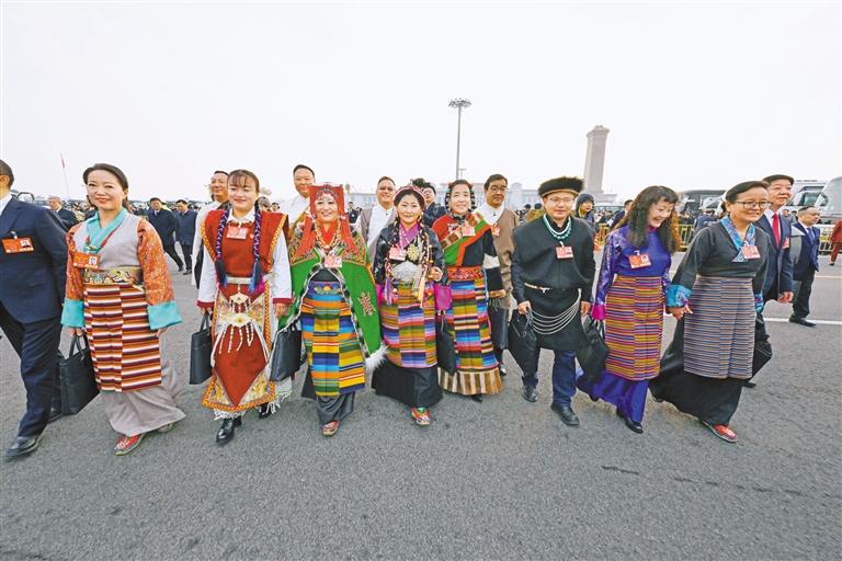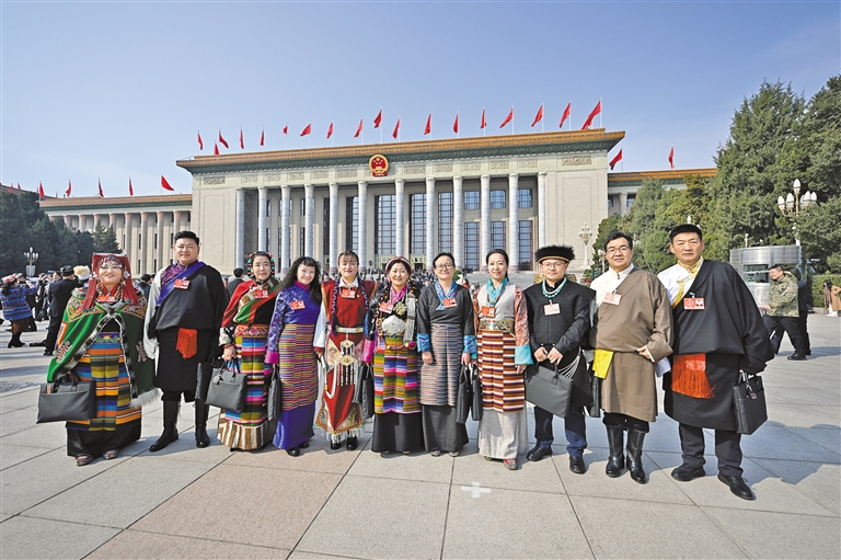 全國人大代表聆聽政府工作報(bào)告后,在人民大會堂前合影留念。記者 旦增西旦 攝