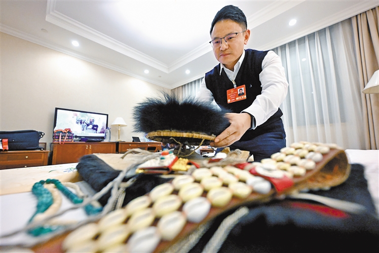 全國人大代表扎西江村在準(zhǔn)備參會時(shí)穿的民族服飾。