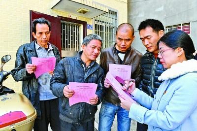 福建省福清市宏路街道紀檢干部(右一)在新倉村向村民分發(fā)黨員干部作風(fēng)問卷調(diào)查表。新華社記者 張國俊攝